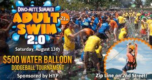 More Rides, More Slides, More Fun Hosted by Dino-Mite Summer Featuring the $500 Water Balloon Dogeball Tournament $20/team of UP TO 4 players Free DinoMite Summer Adult Swim T-Shirt for Dodgeball Players To Register Your Dodgeball Team: https://www.dinomitesummer.com/team/register Free Admission Water Park Featuring: NEW - Zip Line 2 Giant Water Slides 2 Slip N Slides…